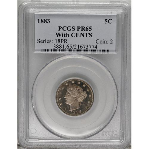 <B>1883 5C With Cents PR65 PCGS.</B></I> PCGS Population (165/48). NGC Census: (173/66). Mintage: 6,783. Numismedia Wsl. Price: $480. (#3881)<BR><BR><b>Shipping:</b> Coins & Currency (<a target="_blank" href="http://www.heritageauctions.com/common/shipping.php">view shipping information</a>)