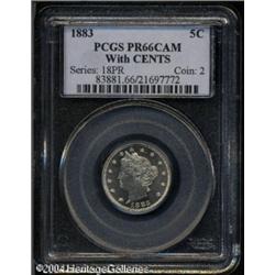 1883 5C With Cents PR66 Cameo PCGS. The mildly fro <B>1883 5C With Cents PR66 Cameo PCGS.</B></I> The mildly frosted devices are highlighted against the reflective fields, and reveal adequate strike definition. Bright, untoned surfaces are virtually devoid of any mentionable contact marks or spots. Population: 16 in 66, 1 finer (10/04). <BR><BR><B>Important notice:</B> Heritage usually auctions material at the rate of 200-250 lots per hour. On some occasions eBay Live bid software or the Internet may not be able to keep up with the pace of the auction. We recommend placing a realistic absentee bid now as insurance to avoid disappointment. Occasionally the auctioneer may eliminate or reject an eBay Live bid, and the auctioneer may also reopen a lot after the close of the eBay live bidding (usually because we missed an audience bid), and may reject your bid even if it shows you as the winning bidder. By bidding via eBay Live, you agree that Heritage may award the lot to another bidder at its sole discretion under the circumstances described above or any other reasonable circumstances. Since eBay bids are not shown to us until we open the lot on the floor, we treat those bids just like floor bids. In most cases the floor responds before the eBay bid is presented to us, due to Internet lag time, so for consistency we have made it a policy that floor bids are always considered first over tie eBay live bids. Also please note that all Heritage lots purchased through eBay Live carry a 20% Buyer's Premium. Please make sure you read the Terms and Conditions before you bid. This lot is being auctioned in conjunction with a live floor auction by Heritage Galleries & Auctioneers. All final auction and invoice information will be supplied by Heritage Galleries & Auctioneers, and all other information should be considered preliminary. Lot:5539