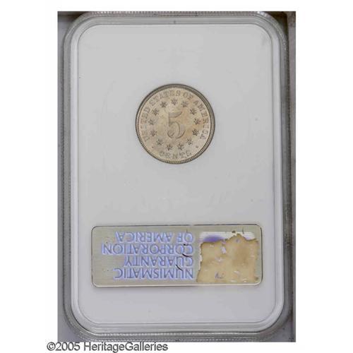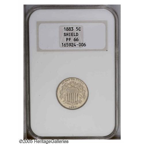 <B>1883<5C> PR66 NGC.</B></I> Representing the last year of issuance for the Shield variety, this example is outstanding for the grade with moderate amounts of reflectivity in the fields and a thin layer of streaky copper-gold patina over the surfaces. Housed in an older NGC holder.
