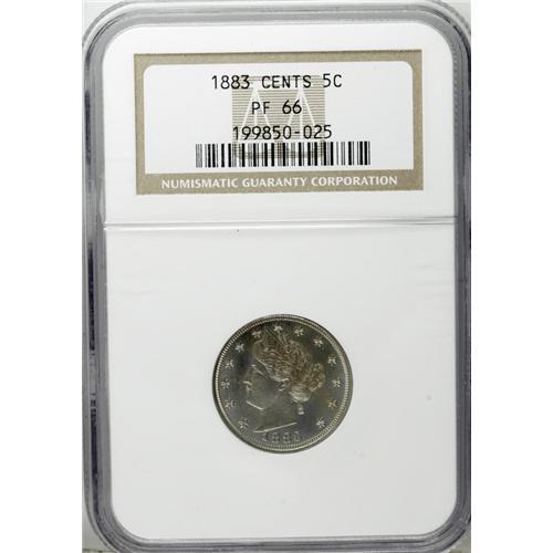 <B>1883 5C With Cents PR66 NGC.</B></I> Well struck, frosty devices yield a pleasing contrast with the reflective fields. Delicate yellow and orange-gold travels over well cared for surfaces. Census: 59 in 66, 6 finer (10/06).<BR><BR><b>Shipping:</b> Coin/Currency (<a target="_blank" href="http://www.heritageauctions.com/common/shipping.php">view shipping information</a>)