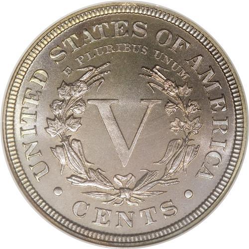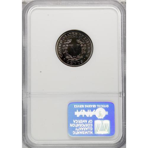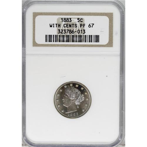 <B>1883 5C With Cents PR67 NGC.</B></I> The With Cents design modification was a direct result of the abuses that took place when the No Cents coins were first issued. An absolutely dazzling proof, this Superb Gem has vibrant rose toning that is intermingled with pale blue and light gold. Both sides are sharply detailed. Only five finer proof examples of this variety have been certified by NGC, including Cameo and Ultra Cameo examples, although this piece is tied for the finest non-Cameo representative. Census: 8 in 67, 0 finer (4/07).<BR><BR><b>Shipping:</b> Coins & Currency (<a target="_blank" href="http://www.heritageauctions.com/common/shipping.php">view shipping information</a>)