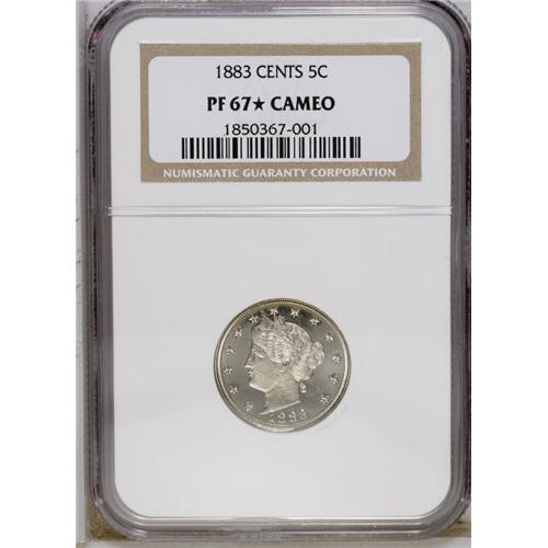 <B>1883 5C With Cents PR67 <img border='0' src='http://www.heritagecoins.com/images/star.gif' width=10 height=10> Cameo NGC.</B></I> This fully brilliant Superb Gem has consistently deep frost, and the white-on-black contrast is exceptional. These characteristics garnered the coveted Star designation from NGC. The strike is bold except for the left ear of corn. Census: 1 in 67 <img border='0' src='http://www.heritagecoins.com/images/star.gif' width=10 height=10> Cameo, 1 finer (11/06).<BR><BR><b>Shipping:</b> Coin/Currency (<a target="_blank" href="http://www.heritageauctions.com/common/shipping.php">view shipping information</a>)