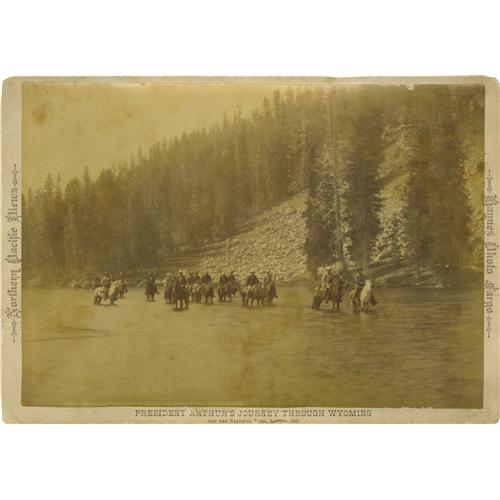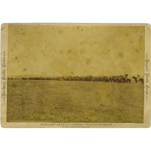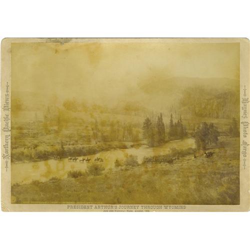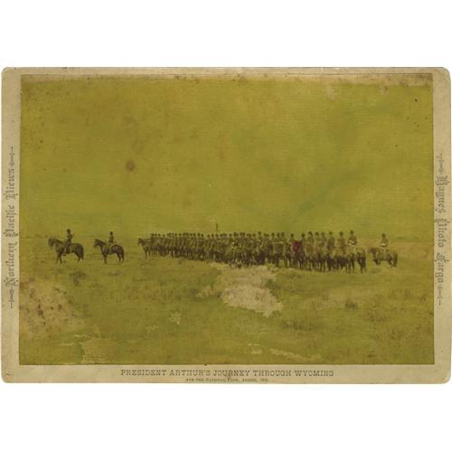 <B>Series of Five Albumen Imperial Cabinet Cards From Chester A. Arthur's 1883 Trip to Yellowstone.</B></I> A rare set of five sepia octavo (6.75" x 9.75") photographs taken by Professor F. J. Haynes. The photographs feature President Chester A. Arthur (1830-1886) and his mounted party in beautiful western settings (mountains, lakes, trees) and some taken on the plains. One photograph depicts a long line of mounted Indians who came to greet Arthur, many of whom are holding umbrellas over their heads. Forty-four enlisted men and four officers of the U.S. Army were detailed to protect Arthur on his trip. A photograph of the mounted detachment is included in the series. All photographs are mounted on the photographer's mounting board. On the left margin of each card is printed "<I>National Pacific Views</B></I>", on the right side "<I>Haynes Photo Fargo</B></I>" and at the bottom is printed "<I>President Arthur's Journey Through Wyoming</B></I>". There are profuse notes written in pencil on the verso of each photograph. The photographs are in good to very good condition with liberal amounts of foxing to the images.<BR>Frank Jay Haynes (1853-1921) was a prolific photographer who traveled throughout North and South Dakota, Montana, Wyoming, Idaho, Oregon, Washington, Alaska, and Western Canada. He was a photographer for the Northern Pacific Railroad, the Black Hills Stage Company, and the Puget Sound and Alaska Steam Ship Line. He operated studios out of Fargo, North Dakota; Yellowstone Naional Park; St. Paul, Minnesota; and a traveling railroad studio along the Northern Pacific line. In 1883, he was named the official photographer for President Chester A. Arthur's trip to Yellowstone.<BR><BR><b>Shipping:</b> Small Flat (<a target="_blank" href="http://www.heritageauctions.com/common/shipping.php">view shipping information</a>)