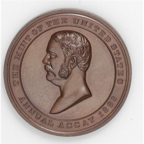 <B>1883 Assay Commission Medal. PR64 Brown Uncertified.</B></I> Julian AC-26, R.5. Copper, 33.6 mm., 314.8 grains. The obverse has a bust of President Chester A. Arthur facing left, with the legend THE MINT OF THE UNITED STATES and ANNUAL ASSAY 1883. The reverse is from the same die used in 1882. The engraver of this medal is generally cited as George Morgan, based on an entry in the 1914 catalog of the National Numismatic Collection. This is a splendid example with rich chestnut-brown surfaces. The interior field on the obverse is reflective with hints of lilac and iridescent toning. The reverse is similarly toned and both sides are sharply struck. A tiny chatter mark is visible beneath OP of OPUS on the reverse.<BR><I>Ex: Boyd Collection, according to our consignor.</B></I>