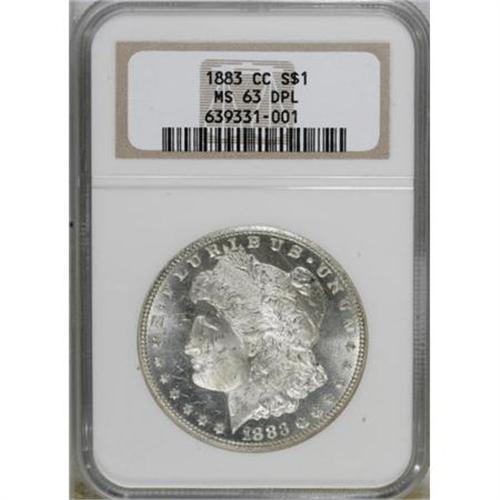 <B>1883-CC $1 MS63 Deep Mirror Prooflike NGC.</B></I> NGC Census: (317/749). PCGS Population (850/1903). Numismedia Wsl. Price for NGC/PCGS coin in MS63: $380. (#97145)<BR><BR><b>Shipping:</b> Coins & Currency (<a target="_blank" href="http://www.heritageauctions.com/common/shipping.php">view shipping information</a>)