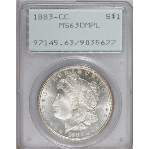 <B>1883-CC $1 MS63 Deep Mirror Prooflike PCGS.</B></I> PCGS Population (837/1864). NGC Census: (307/745). Numismedia Wsl. Price for NGC/PCGS coin in MS63: $380. (#97145)<BR><BR><b>Shipping:</b> Coins & Currency (<a target="_blank" href="http://www.heritageauctions.com/common/shipping.php">view shipping information</a>)