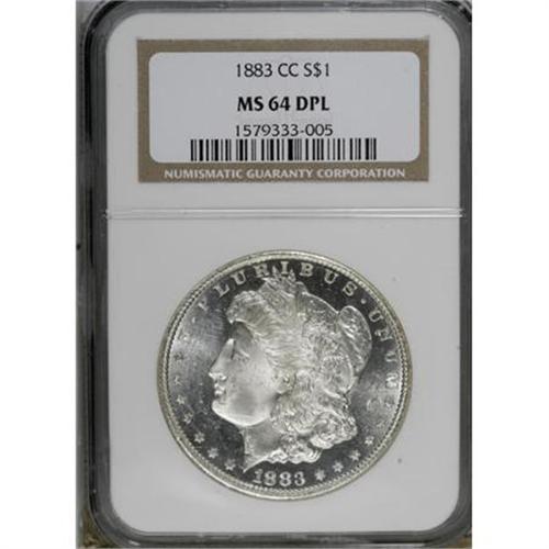 <B>1883-CC $1 MS64 Deep Mirror Prooflike NGC.</B></I> . NGC Census: (508/239). PCGS Population (1156/732). Numismedia Wsl. Price for NGC/PCGS coin in MS64: $525. (#97145)<BR><BR><b>Shipping:</b> Coins & Currency (<a target="_blank" href="http://www.heritageauctions.com/common/shipping.php">view shipping information</a>)