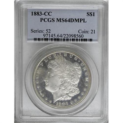 <B>1883-CC $1 MS64 Deep Mirror Prooflike PCGS.</B></I> PCGS Population (1124/723). NGC Census: (500/245). Numismedia Wsl. Price for NGC/PCGS coin in MS64: $525. (#97145)<BR><BR><b>Shipping:</b> Coins & Currency (<a target="_blank" href="http://www.heritageauctions.com/common/shipping.php">view shipping information</a>)