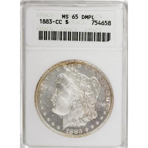 <B>1883-CC $1 MS65 Deep Mirror Prooflike ANACS.</B></I> NGC Census: (199/40). PCGS Population (623/104). Numismedia Wsl. Price for NGC/PCGS coin in MS65: $1,300. (#97145)<BR><BR><b>Shipping:</b> Coins & Currency (<a target="_blank" href="http://www.heritageauctions.com/common/shipping.php">view shipping information</a>)
