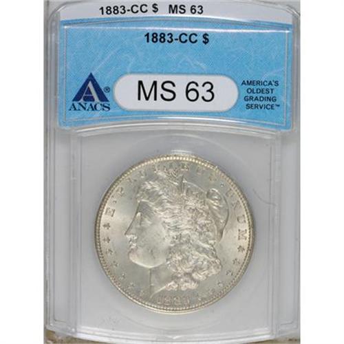 <B>1883-CC $1 MS63 ANACS.</B></I> NGC Census: (2332/8636). PCGS Population (6462/18571). Mintage: 1,204,000. Numismedia Wsl. Price for NGC/PCGS coin in MS63: $183. (#7144)<BR><BR><b>Shipping:</b> Coins & Currency (<a target="_blank" href="http://www.heritageauctions.com/common/shipping.php">view shipping information</a>)
