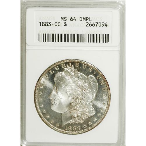 <B>1883-CC $1 MS64 Deep Mirror Prooflike ANACS.</B></I> NGC Census: (496/235). PCGS Population (1120/708). Numismedia Wsl. Price for NGC/PCGS coin in MS64: $550. (#97145)<BR><BR><b>Shipping:</b> Coins & Currency (<a target="_blank" href="http://www.heritageauctions.com/common/shipping.php">view shipping information</a>)