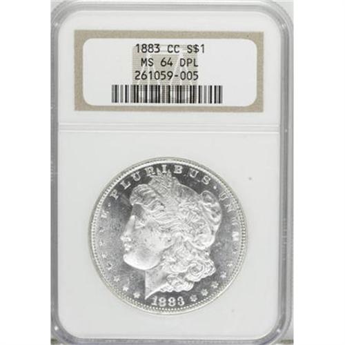 <B>1883-CC $1 MS64 Deep Mirror Prooflike NGC.</B></I> NGC Census: (498/237). PCGS Population (1119/706). Numismedia Wsl. Price for NGC/PCGS coin in MS64: $550. (#97145)<BR><BR><b>Shipping:</b> Coins & Currency (<a target="_blank" href="http://www.heritageauctions.com/common/shipping.php">view shipping information</a>)