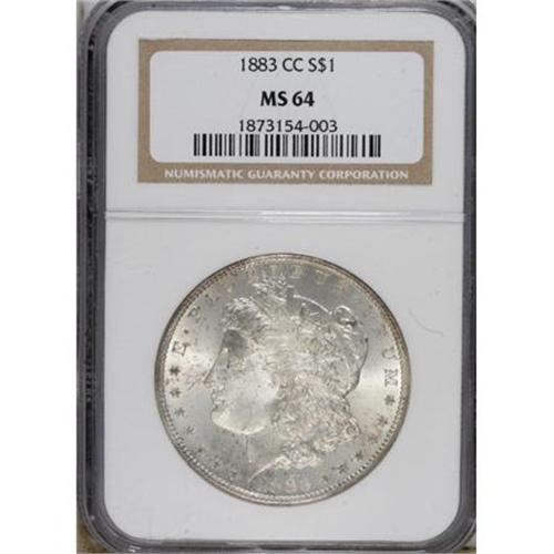 <B>1883-CC $1 MS64 NGC.</B></I> NGC Census: (4545/4091). PCGS Population (10709/7862). Mintage: 1,204,000. Numismedia Wsl. Price for NGC/PCGS coin in MS64: $200. (#7144)<BR><BR><b>Shipping:</b> Coins & Currency (<a target="_blank" href="http://www.heritageauctions.com/common/shipping.php">view shipping information</a>)