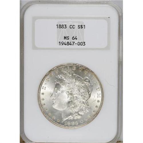 <B>1883-CC S$1 MS64 NGC. Population: 10775 in 64, 7931 finer (6/07).Census: 4593 in 64, 4129 finer (6/07).</B></I><BR><BR><B>Coin Engraver:</B> George T. Morgan<BR><BR><b>Shipping:</b> Coins & Currency (<a target="_blank" href="http://www.heritageauctions.com/common/shipping.php">view shipping information</a>\)