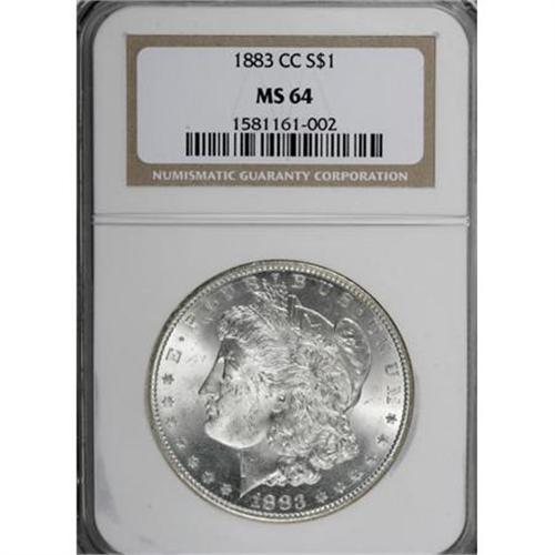 <B>1883-CC $1 MS64 NGC.</B></I> NGC Census: (4627/4168). PCGS Population (10875/8005). Mintage: 1,204,000. Numismedia Wsl. Price for NGC/PCGS coin in MS64: $200. (#7144)<BR><BR><B>Coin Engraver:</B> George T. Morgan<BR><BR><b>Shipping:</b> Coins & Currency (<a target="_blank" href="http://www.heritageauctions.com/common/shipping.php">view shipping information</a>)