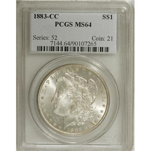 <B>1883-CC $1 MS64 PCGS.</B></I> PCGS Population (10833/7965). NGC Census: (4627/4168). Mintage: 1,204,000. Numismedia Wsl. Price for NGC/PCGS coin in MS64: $200. (#7144)<BR><BR><B>Coin Engraver:</B> George T. Morgan<BR><BR><b>Shipping:</b> Coins & Currency (<a target="_blank" href="http://www.heritageauctions.com/common/shipping.php">view shipping information</a>)