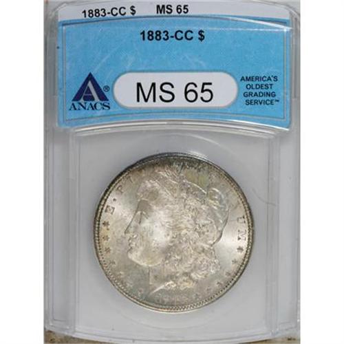 <B>1883-CC $1 MS65 ANACS.</B></I> NGC Census: (3297/832). PCGS Population (6291/1640). Mintage: 1,204,000. Numismedia Wsl. Price for NGC/PCGS coin in MS65: $344. (#7144)<BR><BR><B>Coin Engraver:</B> George T. Morgan<BR><BR><b>Shipping:</b> Coins & Currency (<a target="_blank" href="http://www.heritageauctions.com/common/shipping.php">view shipping information</a>\)