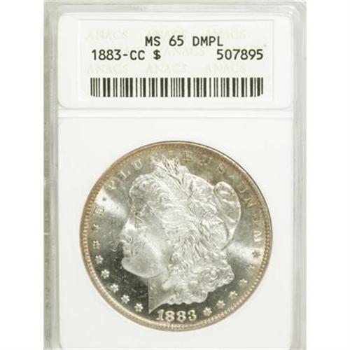 <B>1883-CC $1 MS65 Deep Mirror Prooflike ANACS.</B></I> The depth of reflectivity in the jet-black fields of this Gem example is truly remarkable, for a business strike coin. Well struck and nicely preserved, with few marks and minimal haze in the glassy fields. <BR><BR><b>Shipping:</b> Coins & Currency (<a target="_blank" href="http://www.heritageauctions.com/common/shipping.php">view shipping information</a>)