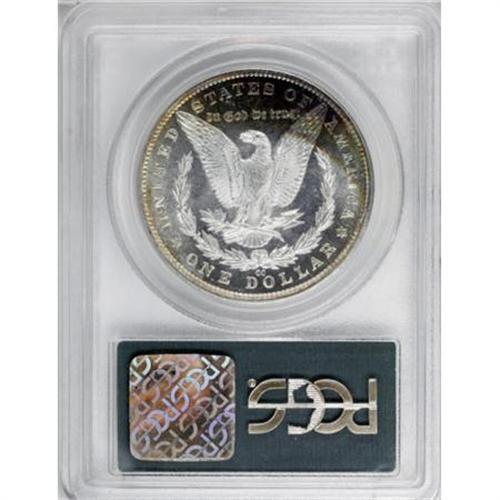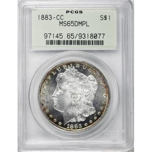 <B>1883-CC $1 MS65 Deep Mirror Prooflike PCGS.</B></I> Deeply reflective and flashy fields leave little doubt as to this Carson City dollar's Deep Mirror Prooflike status. The centers of this solidly struck Gem are untoned, while the obverse margins show elements of gold-orange and the upper right reverse shows bands of violet, orange, blue, and green-gold.<BR><BR><b>Shipping:</b> Coins & Currency (<a target="_blank" href="http://www.heritageauctions.com/common/shipping.php">view shipping information</a>)
