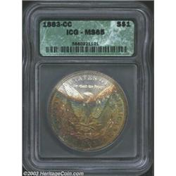 1883-CC $1 MS65 ICG. The reverse is dominated by an arc of intermingled powder-blue, rose-violet,...