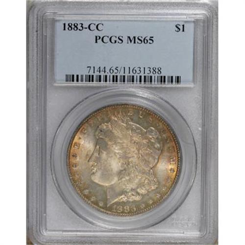 <B>1883-CC $1 MS65 PCGS.</B></I> PCGS Population (6291/1640). NGC Census: (3297/832). Mintage: 1,204,000. Numismedia Wsl. Price for NGC/PCGS coin in MS65: $344. (#7144)<BR><BR><B>Coin Engraver:</B> George T. Morgan<BR><BR><b>Shipping:</b> Coins & Currency (<a target="_blank" href="http://www.heritageauctions.com/common/shipping.php">view shipping information</a>\)