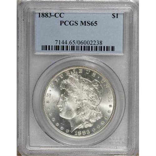 <B>1883-CC $1 MS65 PCGS.</B></I> PCGS Population (6292/1647). NGC Census: (3308/841). Mintage: 1,204,000. Numismedia Wsl. Price for NGC/PCGS coin in MS65: $344. (#7144)<BR><BR><B>Coin Engraver:</B> George T. Morgan<BR><BR><b>Shipping:</b> Coins & Currency (<a target="_blank" href="http://www.heritageauctions.com/common/shipping.php">view shipping information</a>)