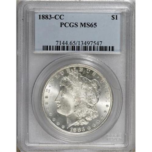 <B>1883-CC $1 MS65 PCGS.</B></I> PCGS Population (6292/1647). NGC Census: (3308/841). Mintage: 1,204,000. Numismedia Wsl. Price for NGC/PCGS coin in MS65: $344. (#7144)<BR><BR><B>Coin Engraver:</B> George T. Morgan<BR><BR><b>Shipping:</b> Coins & Currency (<a target="_blank" href="http://www.heritageauctions.com/common/shipping.php">view shipping information</a>)