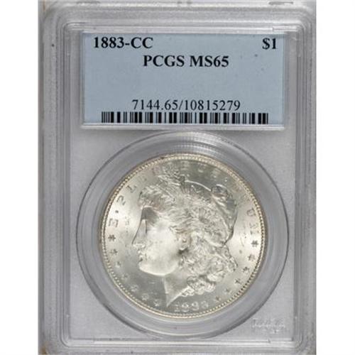 <B>1883-CC $1 MS65 PCGS.</B></I> PCGS Population (6360/1669). NGC Census: (3322/846). Mintage: 1,204,000. Numismedia Wsl. Price for NGC/PCGS coin in MS65: $344. (#7144)<BR><BR><B>Coin Engraver:</B> George T. Morgan<BR><BR><b>Shipping:</b> Coins & Currency (<a target="_blank" href="http://www.heritageauctions.com/common/shipping.php">view shipping information</a>)