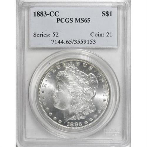 <B>1883-CC $1 MS65 PCGS.</B></I> PCGS Population (6435/1706). NGC Census: (3389/877). Mintage: 1,204,000. Numismedia Wsl. Price for NGC/PCGS coin in MS65: $335. (#7144)<BR><BR><B>Coin Engraver:</B> George T. Morgan<BR><BR><b>Shipping:</b> Coins & Currency (<a target="_blank" href="http://www.heritageauctions.com/common/shipping.php">view shipping information</a>)