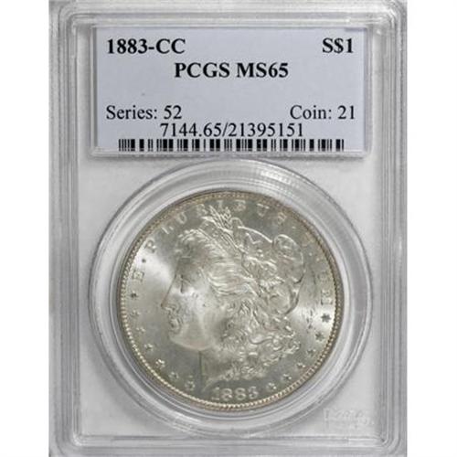 <B>1883-CC $1 MS65 PCGS.</B></I> PCGS Population (6451/1714). NGC Census: (3392/892). Mintage: 1,204,000. Numismedia Wsl. Price for NGC/PCGS coin in MS65: $335. (#7144)<BR><BR><B>Coin Engraver:</B> George T. Morgan<BR><BR><b>Shipping:</b> Coins & Currency (<a target="_blank" href="http://www.heritageauctions.com/common/shipping.php">view shipping information</a>)