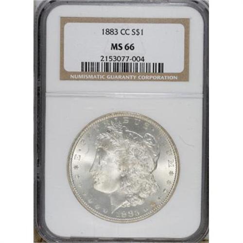 <B>1883-CC $1 MS66 NGC.</B></I> This alluring Premium Gem is virtually untoned, with a lovely satiny sheen and a noticeable paucity of marks on both sides. A reddish-copper toning fleck covers obverse star 12. A popular and readily available Carson City issue. <BR><BR><b>Shipping:</b> Coins & Currency (<a target="_blank" href="http://www.heritageauctions.com/common/shipping.php">view shipping information</a>)