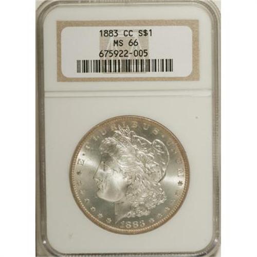 <B>1883-CC $1 MS66 NGC.</B></I> A flashy and slightly frosty representative of this Carson City Morgan dollar issue, crisply struck with russet-peach patina restricted to the rims and essentially untoned surfaces elsewhere. One of slightly over 1.2 million examples coined.<BR><I>From The Vanek Collection.</B></I><BR><BR><b>Shipping:</b> Coins & Currency (<a target="_blank" href="http://www.heritageauctions.com/common/shipping.php">view shipping information</a>)