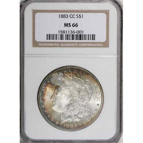 <B>1883-CC $1 MS66 NGC.</B></I> Golden-brown and apple-green toning endows the perimeters of this lustrous Carson City Premium Gem. A clean cheek and nearly unabraded fields confirm the exceptional quality.<BR><BR><B>Coin Engraver:</B> George T. Morgan<BR><BR><b>Shipping:</b> Coins & Currency (<a target="_blank" href="http://www.heritageauctions.com/common/shipping.php">view shipping information</a>)