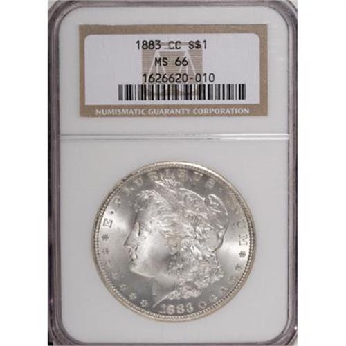 <B>1883-CC $1 MS66 NGC.</B></I> Delightfully frosty and untoned, with simply radiant surfaces that exhibit coruscating luster through the obverse and reverse fields. Generally well struck, if just a tad weak on the hair detail directly above the ear, with a minor bagmark noted near the center of the eagle's breast. <BR><I>From The Oxford Collection.</B></I><BR><BR><B>Coin Engraver:</B> George T. Morgan<BR><BR><b>Shipping:</b> Coins & Currency (<a target="_blank" href="http://www.heritageauctions.com/common/shipping.php">view shipping information</a>)