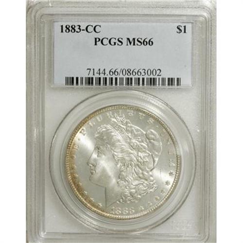 <B>1883-CC $1 MS66 PCGS.</B></I> Pumpkin-gold toning graces the left obverse border of this otherwise brilliant Carson City Morgan. Boldly struck and thoroughly lustrous.<BR><BR><b>Shipping:</b> Coins & Currency (<a target="_blank" href="http://www.heritageauctions.com/common/shipping.php">view shipping information</a>)