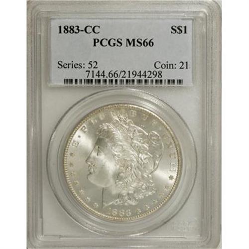 <B>1883-CC $1 MS66 PCGS.</B></I> PCGS Population (1526/114). NGC Census: (743/89). Mintage: 1,204,000. Numismedia Wsl. Price for NGC/PCGS coin in MS66: $675. (#7144)<BR><BR><B>Coin Engraver:</B> George T. Morgan<BR><BR><b>Shipping:</b> Coins & Currency (<a target="_blank" href="http://www.heritageauctions.com/common/shipping.php">view shipping information</a>\)