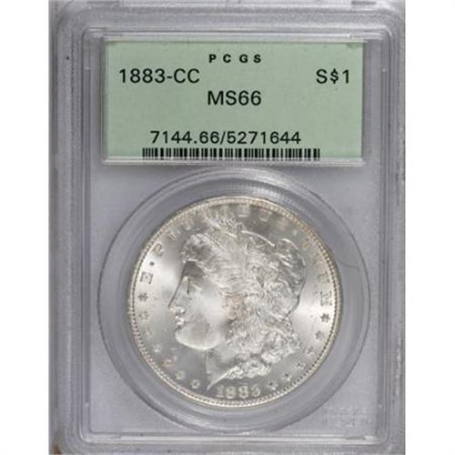 <B>1883-CC $1 MS66 PCGS.</B></I> PCGS Population (1541/114). NGC Census: (757/89). Mintage: 1,204,000. Numismedia Wsl. Price for NGC/PCGS coin in MS66: $675. (#7144)<BR><BR><B>Coin Engraver:</B> George T. Morgan<BR><BR><b>Shipping:</b> Coins & Currency (<a target="_blank" href="http://www.heritageauctions.com/common/shipping.php">view shipping information</a>)