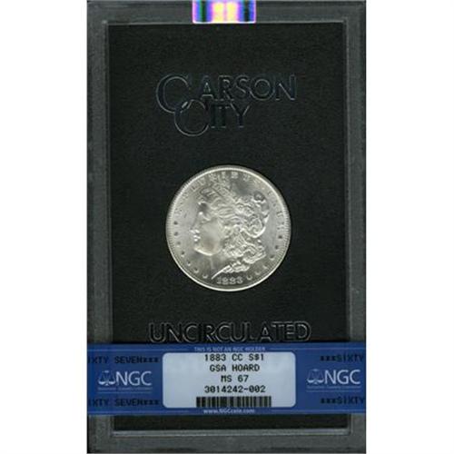 <B>1883-CC $1 MS67 NGC.</B></I> Boldly impressed and shining with a few subtle traces of pink in the fields. The immensely lustrous surfaces are essentially untoned otherwise. This outstanding Carson City Superb Gem is band-certified in the original holder of issue and comes with a GSA box and government certificate. NGC has graded no finer representatives of this famous date (12/07).<BR><BR><B>Coin Engraver:</B> George T. Morgan<BR><BR><b>Shipping:</b> Coins & Currency (<a target="_blank" href="http://www.heritageauctions.com/common/shipping.php">view shipping information</a>)