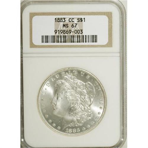 <B>1883-CC $1 MS67 NGC.</B></I> Though the GSA sales yielded a substantial number of Gem and even Premium Gem Carson City dollars, MS67 pieces are far more elusive, owing to the nature of the pieces' prior storage. This gorgeous piece, primarily silver-white with whispers of milky patina in the fields and pink accents on the devices, offers vibrant luster and undeniable eye appeal. NGC has graded no numerically finer representatives (3/08).<BR><BR><B>Coin Engraver:</B> George T. Morgan<BR><BR><b>Shipping:</b> Coins & Currency (<a target="_blank" href="http://www.heritageauctions.com/common/shipping.php">view shipping information</a>)