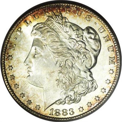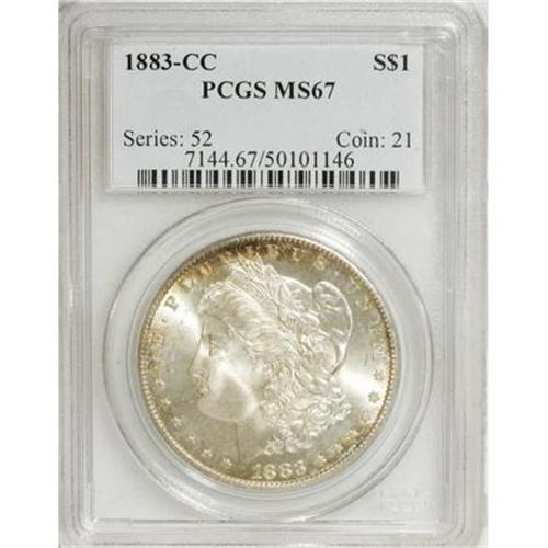 <B>1883-CC $1 MS67 PCGS.</B></I> A wonderful MS67 example of this popular, and relatively common Carson City dollar. The surfaces are thick and heavily frosted, as one would expect from a CC product. Each side is remarkably abrasion-free, an unusual trait on coins from this mint. The centers are mostly untoned with a slight accent of golden patina around the margins.<BR><I>From The Jimmy G. PCGS Registry Collection of Morgan Dollars with Varieties.</B></I><BR><BR><B>Coin Engraver:</B> George T. Morgan<BR><BR><b>Shipping:</b> Coins & Currency (<a target="_blank" href="http://www.heritageauctions.com/common/shipping.php">view shipping information</a>)