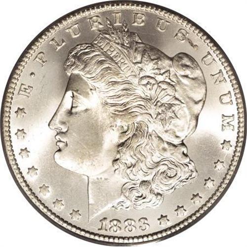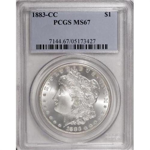 <B>1883-CC $1 MS67 PCGS.</B></I> This is the second most available Carson City Morgan dollar in higher Mint State grades (Bowers, 1993). Bags of 1,000 pieces were released in 1938, in the mid-1950s, and in the early 1960s. This Superb Gem displays cartwheel luster and silver-gray surfaces that reveal traces of light tan on the central reverse. Nicely struck, except for minor softness in the hair over Liberty's ear. A few inoffensive marks are noted. PCGS has graded only three coins finer, as of (1/08).<BR><BR><B>Coin Engraver:</B> George T. Morgan<BR><BR><b>Shipping:</b> Coins & Currency (<a target="_blank" href="http://www.heritageauctions.com/common/shipping.php">view shipping information</a>)