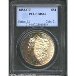 <TR><TD width="100%"><TABLE cellSpacing=1 cellPadding=3 width="100%" border=0><TBODY><TR><TD width="100%" bgColor=#79735c><FONT face=arial color=#ffffff size=3><B>Description</B> </FONT></TD></TR><TR><TD width="100%" bgColor=#ffffff><FONT face=arial size=2><B>1883-CC $1 MS67 PCGS.</B></I> A Superb example with thick mint frost and virtually abrasion-free surfaces. The obverse has a wide arc of deep gray-olive and burnt-orange toning that covers the left half of that side. A beautiful and obviously original example of this popular Carson City Dollar. </FONT></TD></TR></TBODY></TABLE></TD></TR></TBODY></TABLE><BR><A name=PricesRealized></A><TABLE cellSpacing=0 cellPadding=0 width="100%" bgColor=#000000 border=0><TBODY><TR><TD width="100%"><TABLE cellSpacing=1 cellPadding=3 width="100%" border=0><TBODY><TR><TD width="100%" bgColor=#79735c><A name=PR><FONT face=arial color=#ffffff size=3><B>Previous Prices from Heritage Auctions</B> </FONT></A></TD></TR><TR><TD bgColor=#f6f6ed><TABLE cellSpacing=0 cellPadding=0 width="100%" border=1><TBODY><TR><TD align=middle width="33%"><B>Date</B></TD><TD align=middle width="33%"><B>Service</B></TD><TD align=middle width="33%"><B>Price</B></TD></TR><TR bgColor=whitesmoke><TD width="33%"><B>01/11/2003</B></TD><TD width="33%">PCGS</TD><TD width="33%">$3,220.00</TD></TR><TR bgColor=whitesmoke><TD width="33%"><B>02/16/2000</B></TD><TD width="33%">PCGS</TD><TD width="33%">$2,645.00</TD></TR><TR bgColor=whitesmoke><TD width="33%"><B>02/01/2001</B></TD><TD width="33%">PCGS</TD><TD width="33%">$3,220.00</TD></TR><TR bgColor=whitesmoke><TD width="33%"><B>04/27/2002</B></TD><TD width="33%">PCGS</TD><TD width="33%">$4,140.00</TD></TR><TR bgColor=whitesmoke><TD width="33%"><B>09/13/1997</B></TD><TD width="33%">PCGS</TD><TD width="33%">$2,530.00</TD></TR><TR bgColor=whitesmoke><TD width="33%"><B>08/13/1999</B></TD><TD width="33%">PCGS</TD><TD width="33%">$4,600.00</TD></TR><TR bgColor=whitesmoke><TD width="33%"><B>06/10/2000</B></TD><TD width="33%">PCGS</TD><TD width="33%">$3,335.00</TD></TR><TR bgColor=whitesmoke><TD width="33%"><B>01/12/2002</B></TD><TD width="33%">PCGS</TD><TD width="33%">$2,875.00</TD></TR><TR bgColor=whitesmoke><TD width="33%"><B>08/08/2001</B></TD><TD width="33%">PCGS</TD><TD width="33%">$3,335.00</TD></TR><TR bgColor=whitesmoke><TD width="33%"><B>08/08/2001</B></TD><TD width="33%">PCGS</TD><TD width="33%">$3,565.00</TD></TR><TR bgColor=whitesmoke><TD width="33%"><B>11/01/1998</B></TD><TD width="33%">PCGS</TD><TD width="33%">$2,990.00</TD></TR><TR bgColor=whitesmoke><TD width="33%"><B>11/01/1998</B></TD><TD width="33%">PCGS</TD><TD width="33%">$3,335.00</TD></TR><TR bgColor=whitesmoke><TD width="33%"><B>01/01/1999</B></TD><TD width="33%">PCGS</TD><TD width="33%">$4,140.00</TD></TR><TR bgColor=whitesmoke><TD width="33%"><B>03/01/1999</B></TD><TD width="33%">PCGS</TD><TD width="33%">$2,875.00</TD></TR><TR bgColor=whitesmoke><TD width="33%"><B>06/01/2000</B></TD><TD width="33%">PCGS</TD><TD width="33%">$3,450.00</TD></TR><TR bgColor=whitesmoke><TD width="33%"><B>10/01/1998</B></TD><TD width="33%">PCGS</TD><TD width="33%">$4,180.00</TD></TR><TR bgColor=whitesmoke><TD width="33%"><B>01/05/2001</B></TD><TD width="33%">PCGS</TD><TD width="33%">$4,140.00</TD></TR><TR bgColor=whitesmoke><TD width="33%"><B>02/12/2000</B></TD><TD width="33%">PCGS</TD><TD width="33%">$2,990.00</TD></TR><TR bgColor=whitesmoke><TD width="33%"><B>01/06/1996</B></TD><TD width="33%">PCGS</TD><TD width="33%">$2,750.00</TD></TR><TR bgColor=whitesmoke><TD width="33%"><B>05/05/2000</B></TD><TD width="33%">PCGS</TD><TD width="33%">$2,702.50</TD></TR><TR bgColor=whitesmoke><TD width="33%"><B>06/06/1998</B></TD><TD width="33%">PCGS</TD><TD width="33%">$2,990.00</TD></TR><TR bgColor=whitesmoke><TD width="33%"><B>03/23/2003</B></TD><TD width="33%">NGC</TD><TD width="33%">$2,415.00</TD></TR><TR bgColor=whitesmoke><TD width="33%"><B>03/23/2003</B></TD><TD width="33%">NGC</TD><TD width="33%">$2,530.00</TD></TR><TR bgColor=whitesmoke><TD width="33%"><B>10/06/2001</B></TD><TD width="33%">NGC</TD><TD width="33%">$2,645.00</TD></TR><TR bgColor=whitesmoke><TD width="33%"><B>05/05/2000</B></TD><TD width="33%">NGC</TD><TD width="33%">$2,530.00</TD></TR><TR bgColor=whitesmoke><TD width="33%"><B>10/31/2000</B></TD><TD width="33%">NGC</TD><TD width="33%">$2,451.00</TD></TR><TR bgColor=whitesmoke><TD width="33%"><B>01/06/1996</B></TD><TD width="33%">NGC</TD><TD width="33%">$1,650.00</TD></TR><TR bgColor=whitesmoke><TD width="33%"><B>10/06/2000</B></TD><TD width="33%">NGC</TD><TD width="33%">$2,530.00</TD></TR></TBODY></TABLE></TD></TR><TR><TD bgColor=#ffffff><FONT face=arial size=1 ?>PLEASE NOTE: All prices realized reflect the final hammer price PLUS the buyer's premium in auctions that charge a buyer's premium. Each item has a notation at the top of the listing indicating whether that lot included a buyer's premium. Example: A item that sells with a final hammer price of $100 and a 20% buyer's premium will display with a price realized of $120. All information listed is intended to be as accurate as possible, but errors are possible. Please use this guide carefully and inform us of any inaccuracies. </FONT></TD></TR></TBODY></TABLE></TD></TR></TBODY></TABLE><BR><TABLE cellSpacing=0 cellPadding=0 width="100%" bgColor=#000000 border=0><TBODY><TR><TD width="100%"><TABLE cellSpacing=1 cellPadding=3 width="100%" border=0><TBODY><TR><TD width="100%" bgColor=#79735c colSpan=6><FONT face=arial color=#ffffff size=3><B>Price Guide*</B> </FONT></TD></TR><TR bgColor=#f6f6ed><TD align=middle><B>Grade</B> </TD><TD align=middle><B>Coin World<BR>(Trends)</B> </TD><TD align=middle><B>Numismedia<BR>Retail</B> </TD><TD align=middle><B>Numismedia<BR>Wholesale</B> </TD><TD align=middle><B>Coin<BR>Universe</B> </TD><TD align=middle><B>Heritage<BR>Value Index</B> </TD></TR><TR bgColor=#ffffff><TD align=middle>66</TD><TD align=right>$800.00</TD><TD align=right>$730.00</TD><TD align=right>$580.00</TD><TD align=right>$775.00