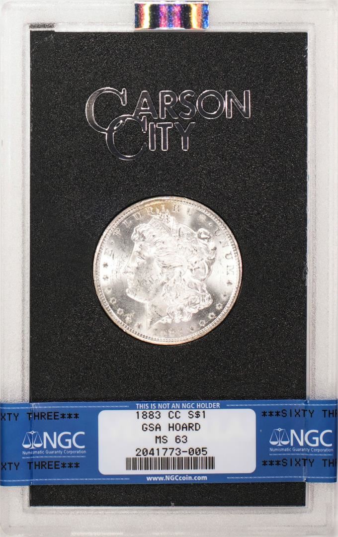 One 1883-CC $1 Morgan Silver Dollar Coin GSA Hoard Uncirculated NGC MS63 w/Box & COA. NGC Certified.