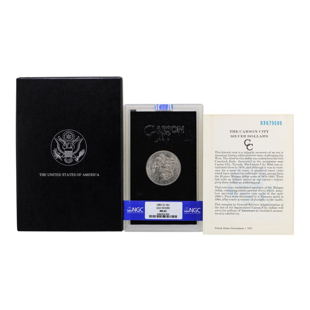 One 1883-CC $1 Morgan Silver Dollar Coin GSA NGC MS62 w/Box & COA. NGC Certified.
