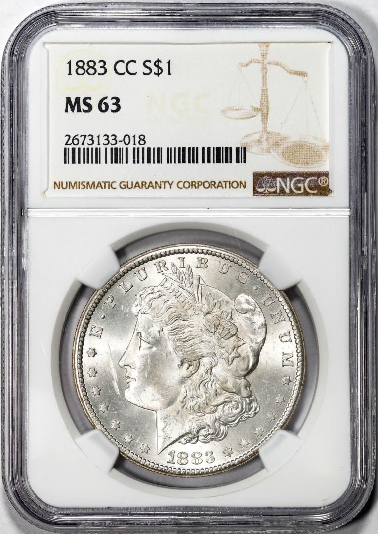 One 1883-CC $1 Morgan Silver Dollar Coin NGC MS63.