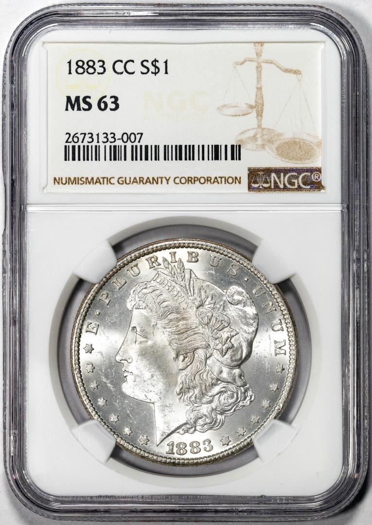 One 1883-CC $1 Morgan Silver Dollar Coin NGC MS63.