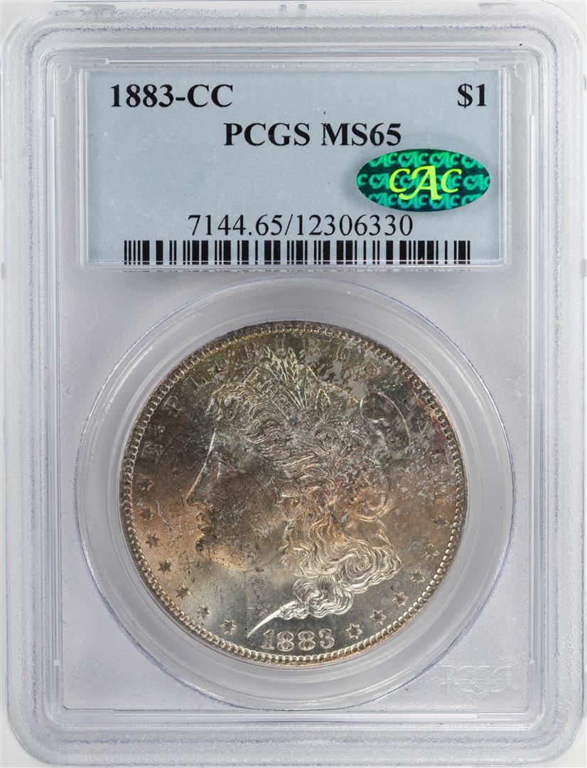 One 1883-CC $1 Morgan Silver Dollar Coin PCGS MS65 CAC Nice Toning. PCGS Graded.