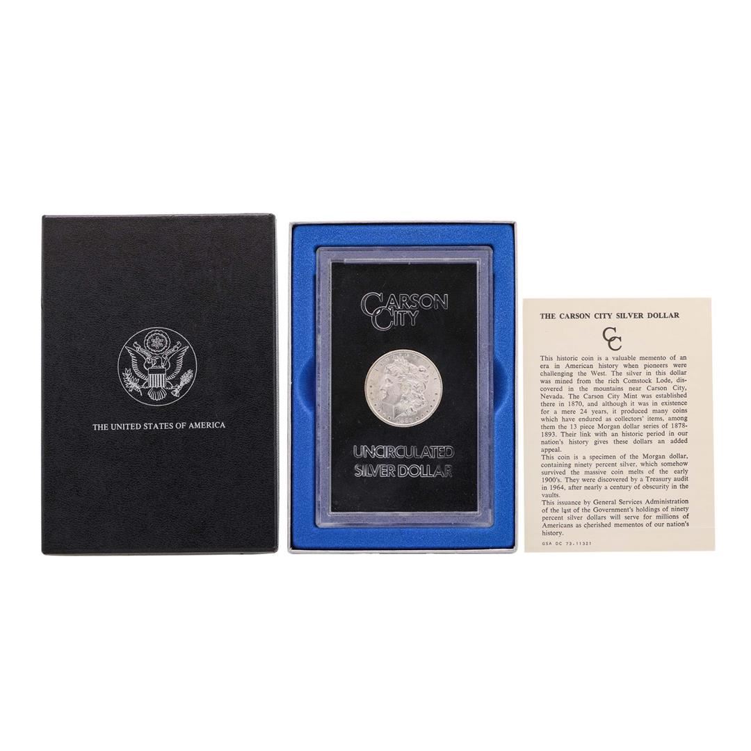 One 1883-CC $1 Morgan Silver Dollar Coin Uncirculated w/ Box GSA & COA.