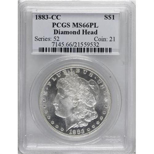 <B>1883-CC $1 MS66 Prooflike PCGS.</B></I> Ex: Diamond Head. PCGS Population (112/7). NGC Census: (56/2). Numismedia Wsl. Price for NGC/PCGS coin in MS66: $1,100. (#7145)<BR><I>From The Diamond Head Registry Set of Prooflike Dollars.</B></I><BR><BR><B>Coin Engraver:</B> George T. Morgan<BR><BR><b>Shipping:</b> Coins & Currency (<a target="_blank" href="http://www.heritageauctions.com/common/shipping.php">view shipping information</a>\)
