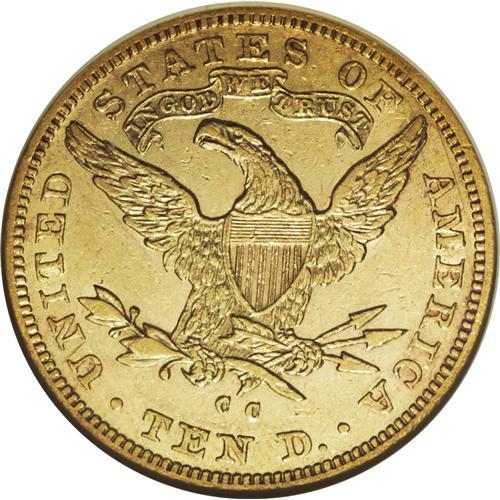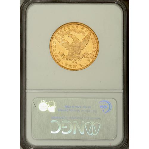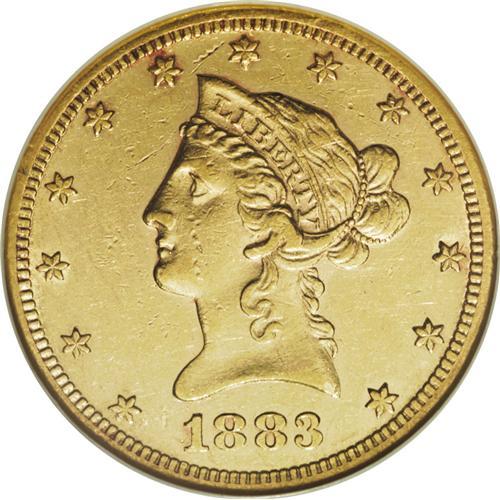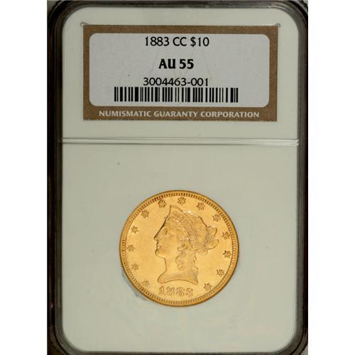 <B>1883-CC $10 AU55 NGC.</B></I> Although more were produced--nearly twice as many--as of the 1882-CC, this issue is equally if not more elusive in near-Mint State. This example offers bold, lustrous canary-yellow surfaces that are blessed with a sharp strike. Although a few reeding marks are noted and light highpoint rub, they fail to detract. Census: 21 in 55, 18 finer (12/06).<BR><BR><b>Shipping:</b> Coin/Currency (<a target="_blank" href="http://www.heritageauctions.com/common/shipping.php">view shipping information</a>)